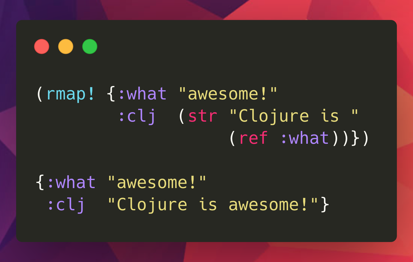 Version 2.1.0 of rmap has been released. This release has some small but powerful additions, one of which is the #rmap/ref tagged literal support. Read on what possibilities this yields.